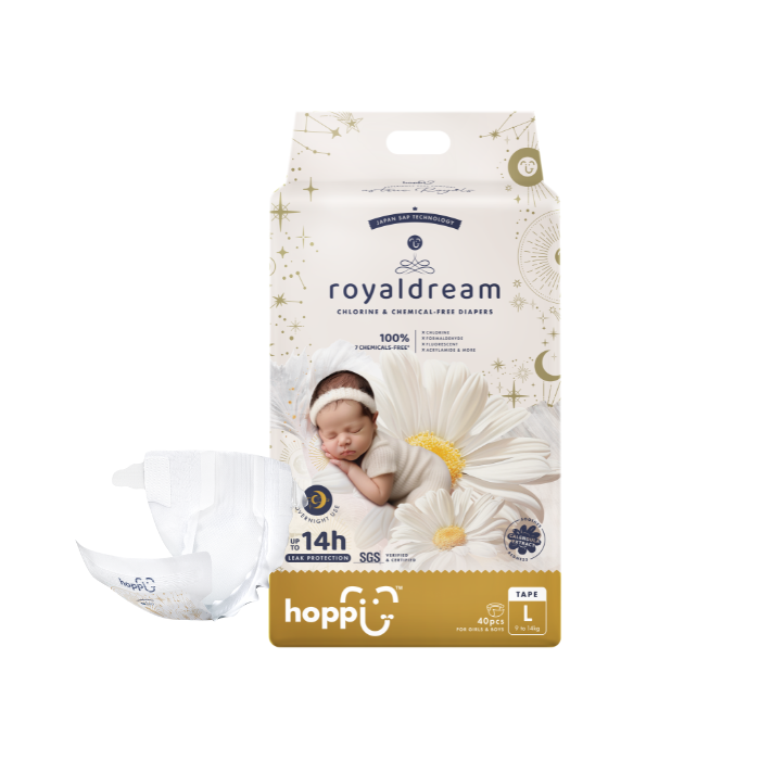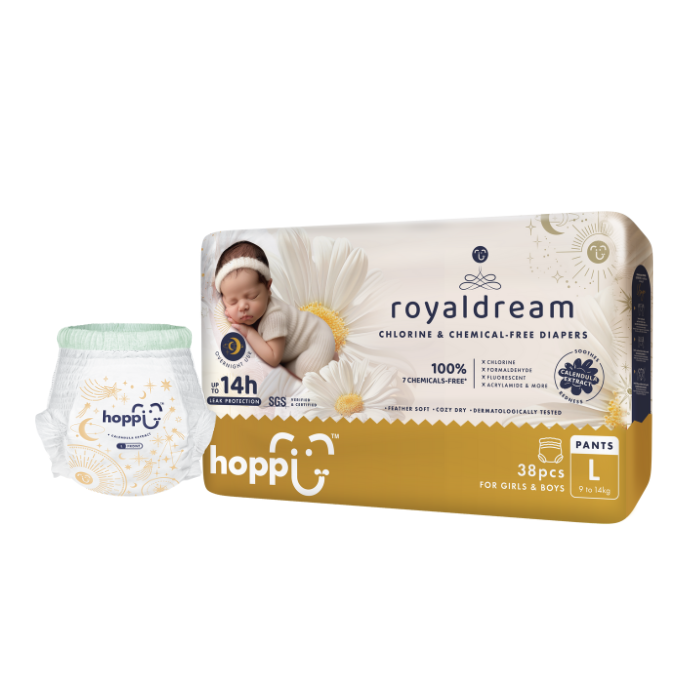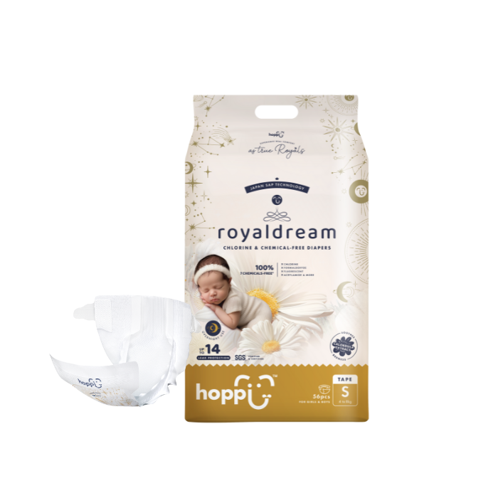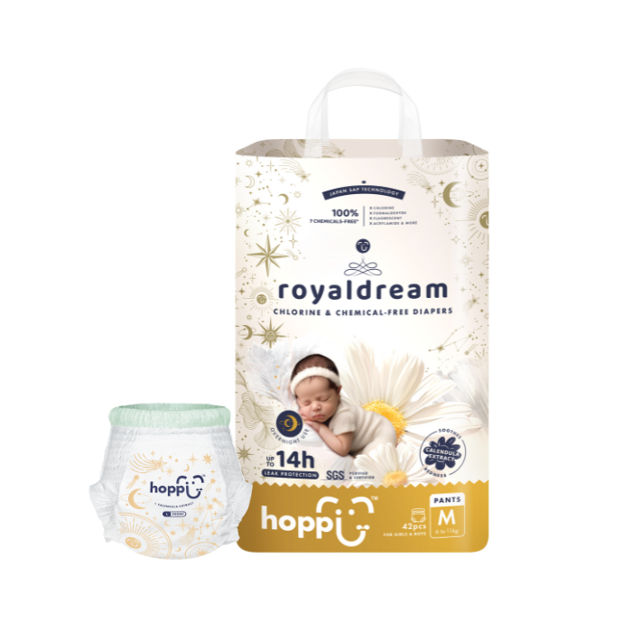 Introducing RoyalDream, 100% Chlorine & Chemical-Free diapers, specially crafted for newborns and hypoallergenic babies. The 3 seconds fast absorbing feature locks away and retains liquid for a grand 14-hours of leak protection. Enhanced with Royal Bubble Belt and the soothing touch of calendula extract, they offer unmatched comfort, giving your babies the royal treatment they deserve.