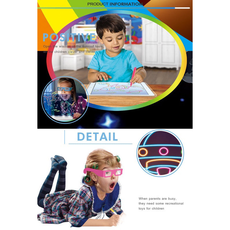 Set includes: 9.5 x 7.5 inches drawing board, 3D glasses, wipe cloth, control board and 4 colored pens