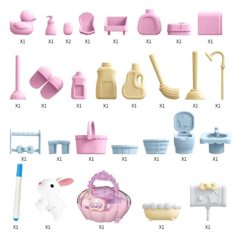 This playset also includes miniature pet rabbits, shell house, washable pen, bathtub, water heater, shelf, chair, cleaning tools, bathing supplies, toilet, wash basin, etc.