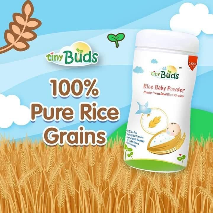 The Internationally awarded Tiny Buds Rice Baby Powder is the 1st baby powder made from 100% real rice grains. It is hypoallergenic and keeps baby’s delicate skin fresh and dry all day. The fine rice grains are so light that they float on water, letting sweat and moisture evaporate through while keeping the skin fresh all day.